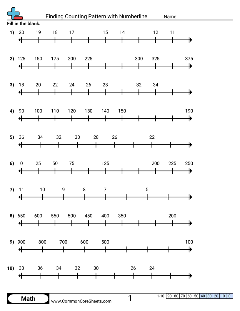 Each worksheet has 10 problems finding the pattern a numberline is using and filling in the blank.