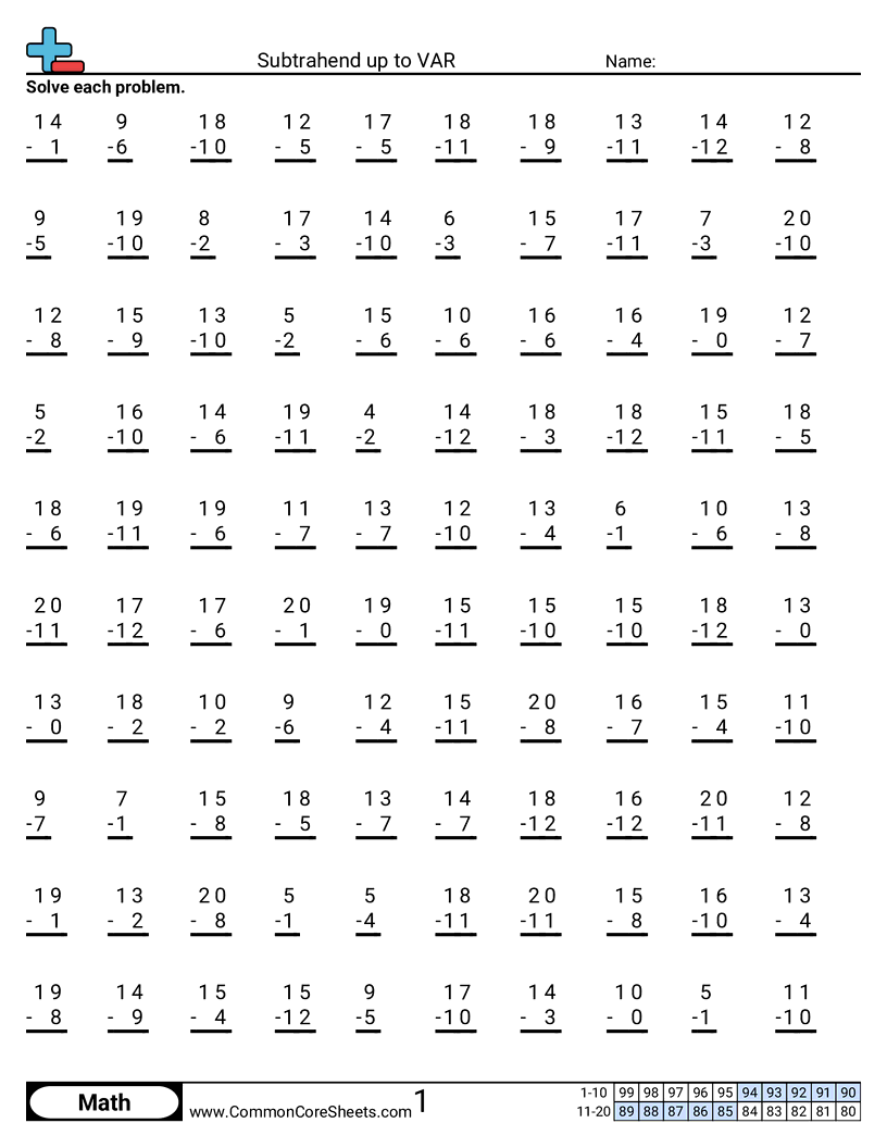 Free math worksheets on Subtrahend up to VAR. Each worksheet has 100 problems with an answer key and are ideal for teachers and homeschooling. You can download the PDF, create a set of flash cards or set it up for online learning.