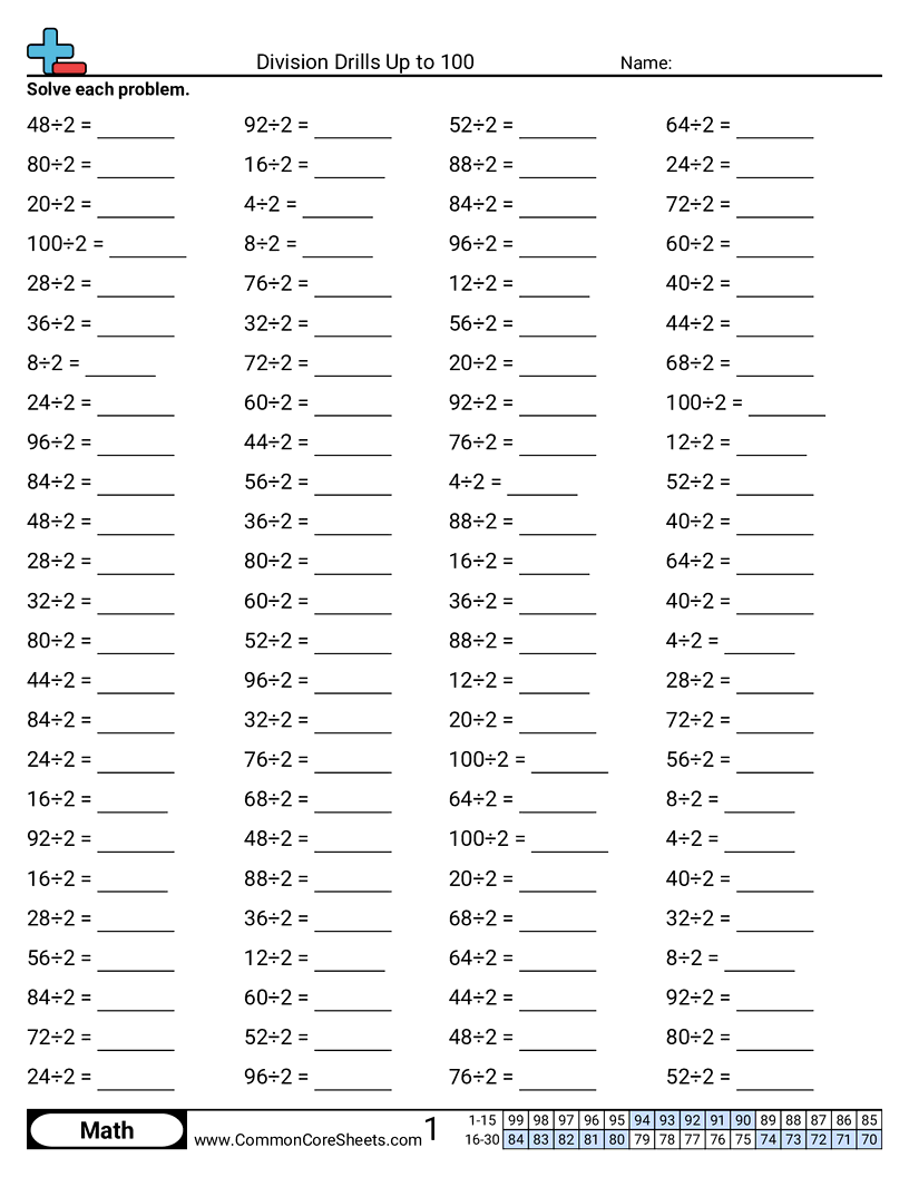 Each worksheet has 100 problems dividing by 2.